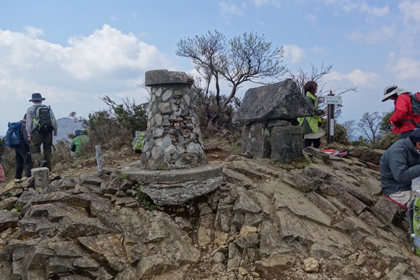 9合目。 お腹空いてきて力が出ないので山頂手前ながらおやつタイムでしばらく休憩。 「山の柿ピーは美味い」とは嫁さん談。 |