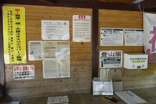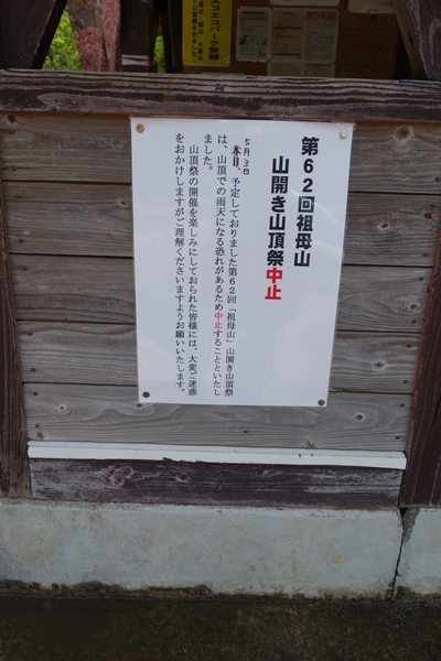 前日が山開きの予定だったようです。 雨天中止なんですね。。 山開き用に準備されていた山バッチは全く残っていませんでした・・残念。 |