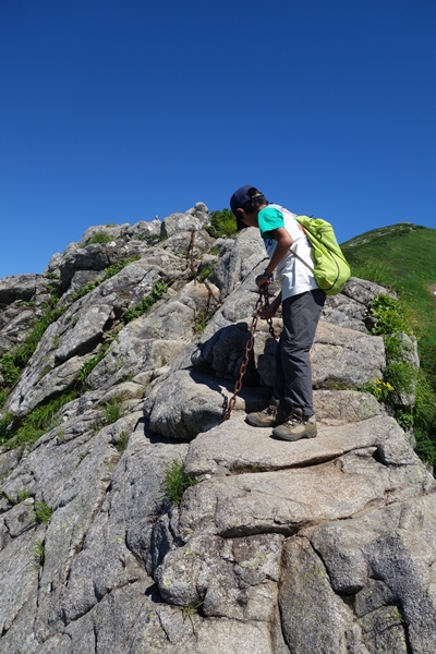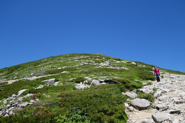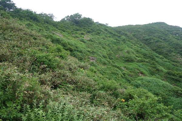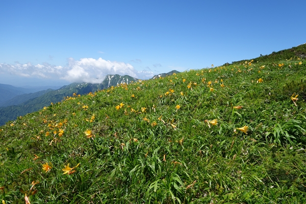 ニッコウキスゲの咲く斜面と疣岩山〜登りはあと少し。 |