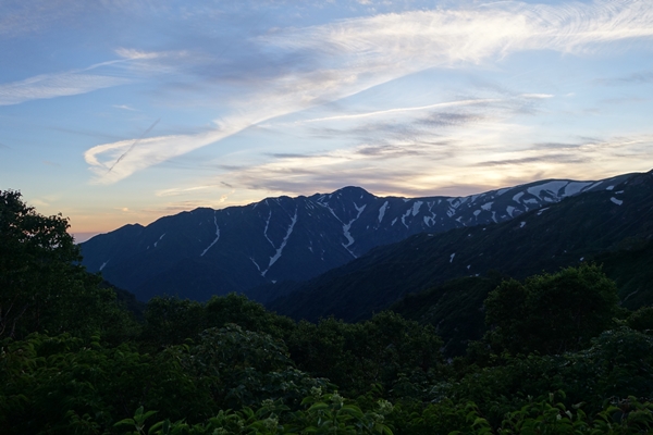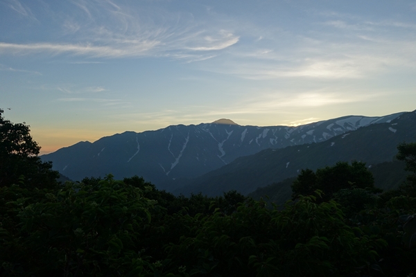 雲が晴れて明日歩く方向もばっちり夕陽に照らされてきました。 一番奥が本山小屋ですね。 |