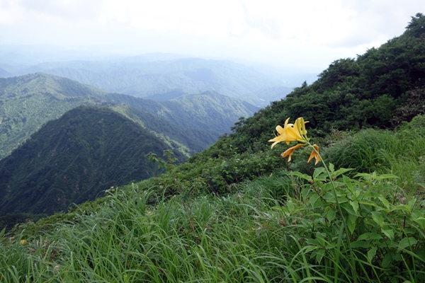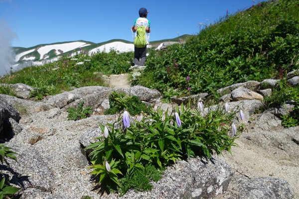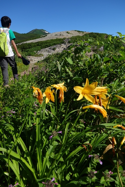 ニッコウキスゲと次男。 今日は身軽なので快調。 |