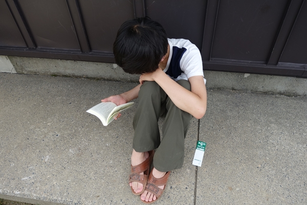山の上で本を読む長男・・良い景色の中で読んでみたかったんだとか。 重いのに担いで上がった気合に感服。 |