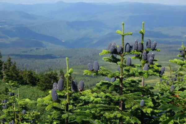 松ぼっくりになる前なのか、紫色が鮮やかなのがいっぱい成ってました。 |