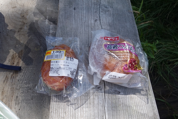弥四郎小屋前のベンチでパンを食べる。 食べてばかり(笑)。 |
