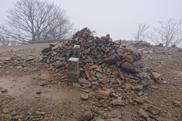 山頂到着。 一等三角点百名山でもあるようですが、この天気では。。 |