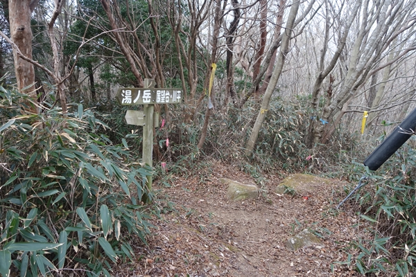 湯ノ岳山頂到着。 看板が一つあるだけで展望も何もなく、山頂感がありません。。 |