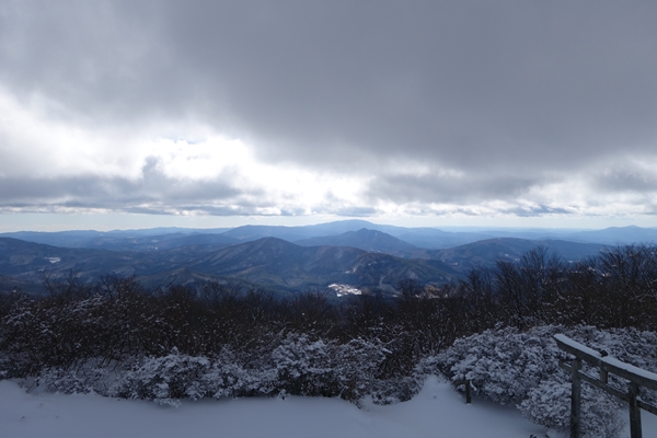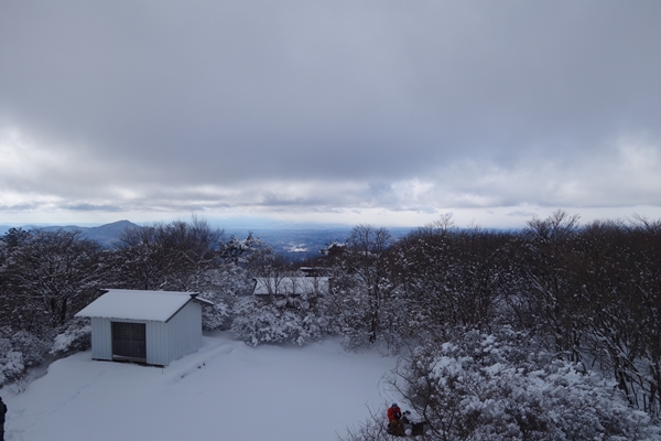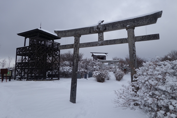 山頂到着。軽アイゼンを外して展望台の上に。 |