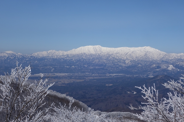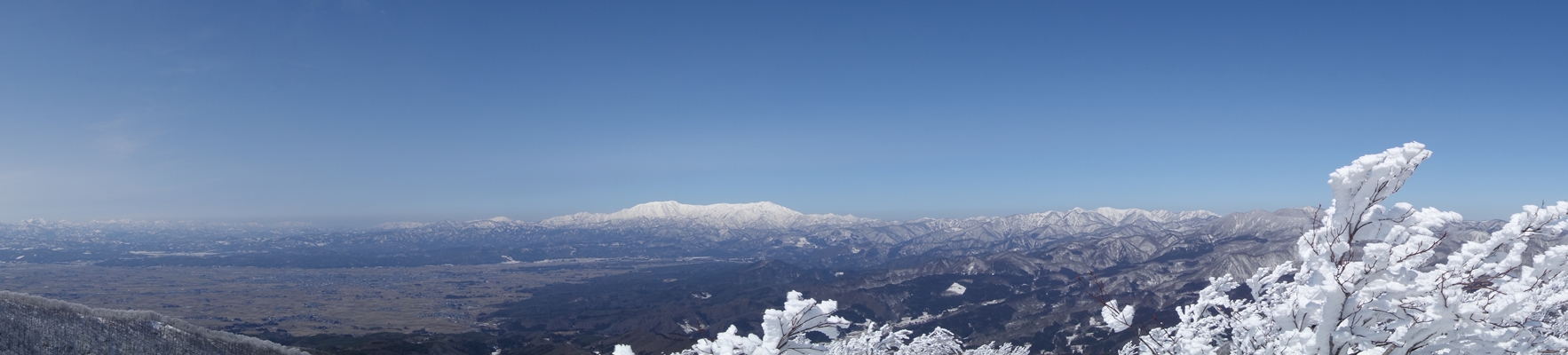 飯豊連峰がドーンと。真っ白。 |
