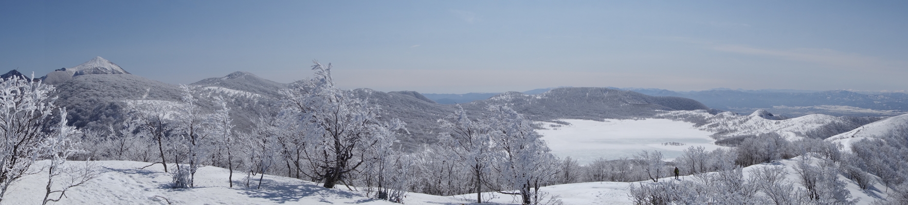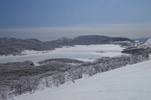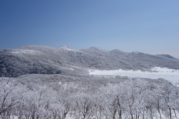 視界が開けてきました。雄国沼が凍って真っ白。 |