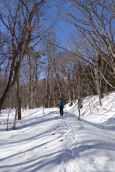 沢沿いの踏み跡をたどります。踏み跡がはっきりしたり、 若干少なくなったり、2本に分かれたり、でした。 |