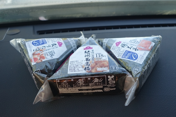 朝食〜半額セールだったおにぎり3つ。 |