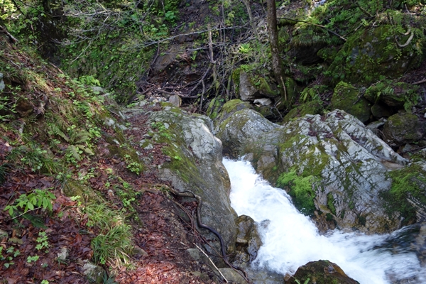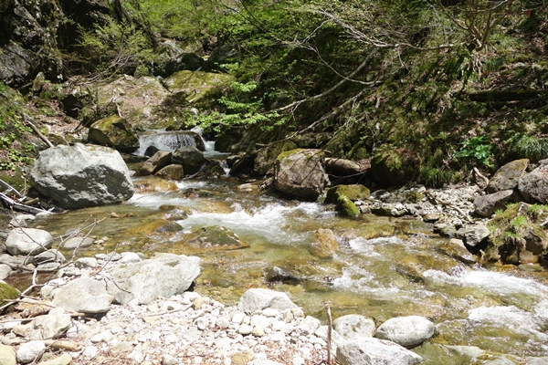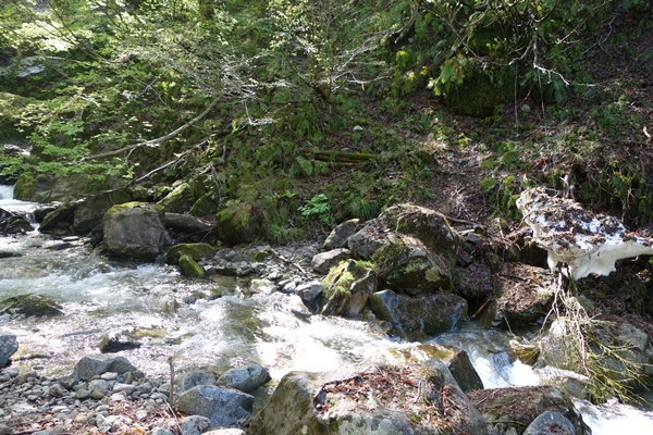 渡渉ポイント。 雪解け水なのか昨日の雨のせいなのか、なかなかの水量でした。 ちょっとバランスを崩しお茶のペットボトルがザックから落ち、流れて行ってしまいました。。 |
