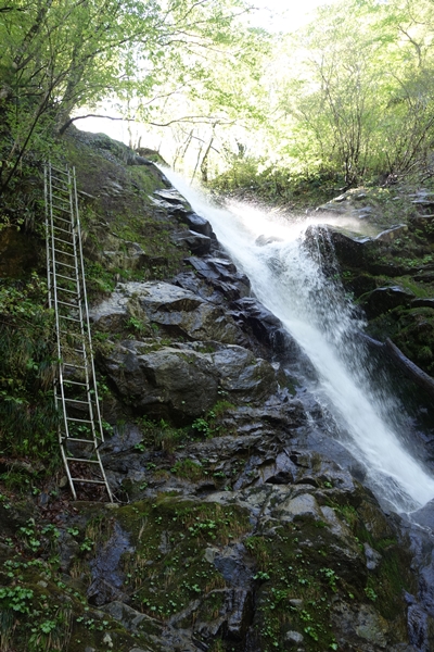 弁財天夫婦滝到着。 左側のハシゴも長い。 |