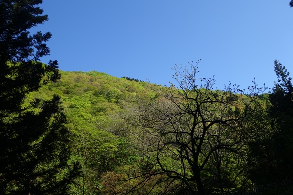登山口で車を止め出発。 青空も新緑も素晴らしい。 |