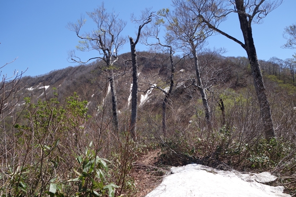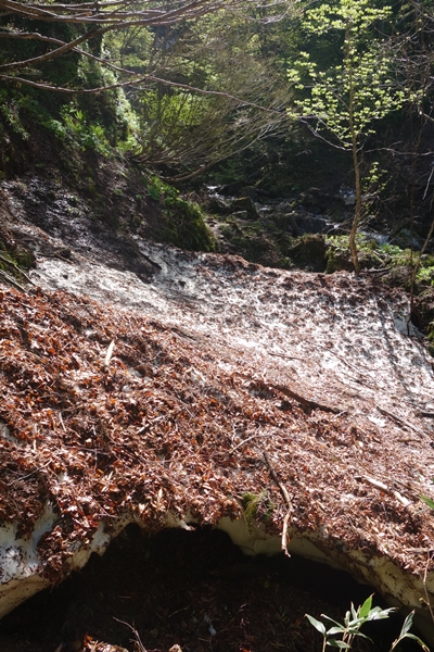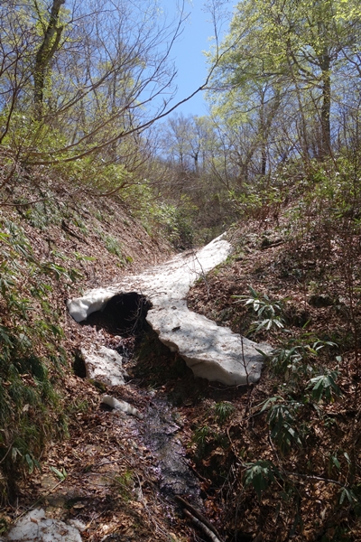 ところどころに残雪。 雪の端を歩いて越えました。 |