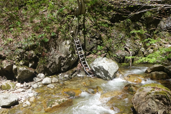渡渉ポイントの近くにハシゴ。 山開きの時に川に渡されるのでしょうか? |