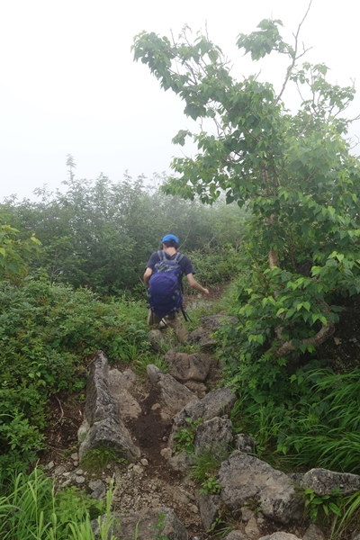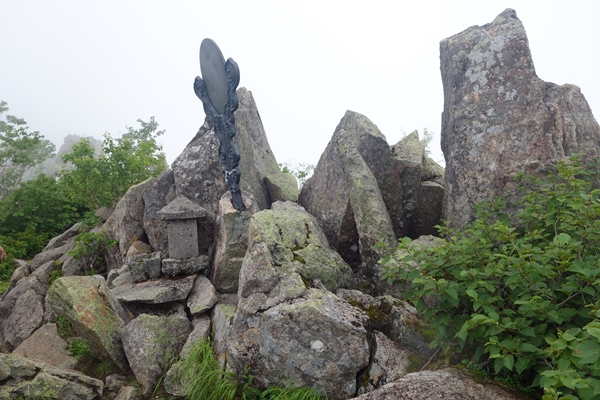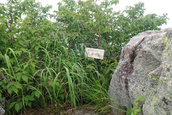 ちゃんとした標柱もありますが、滞在した40分間ずっとガスの中で展望を楽しむことができず残念でした。 長男が持っていたパンを食べてエネルギー補給。 途中で食べるつもりだったのにパンもって先に行っちゃうもんだからガス欠しそうでした。。 |