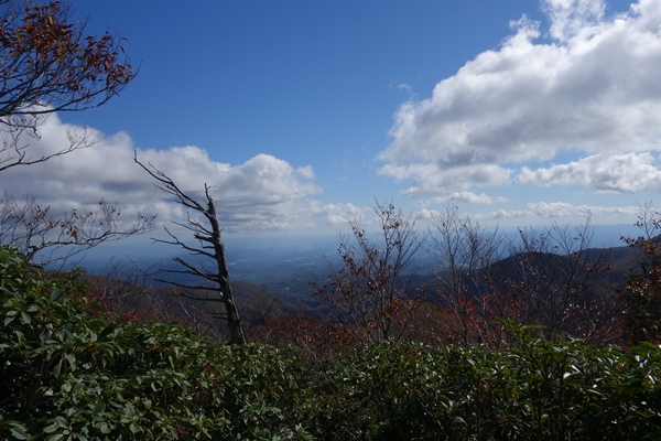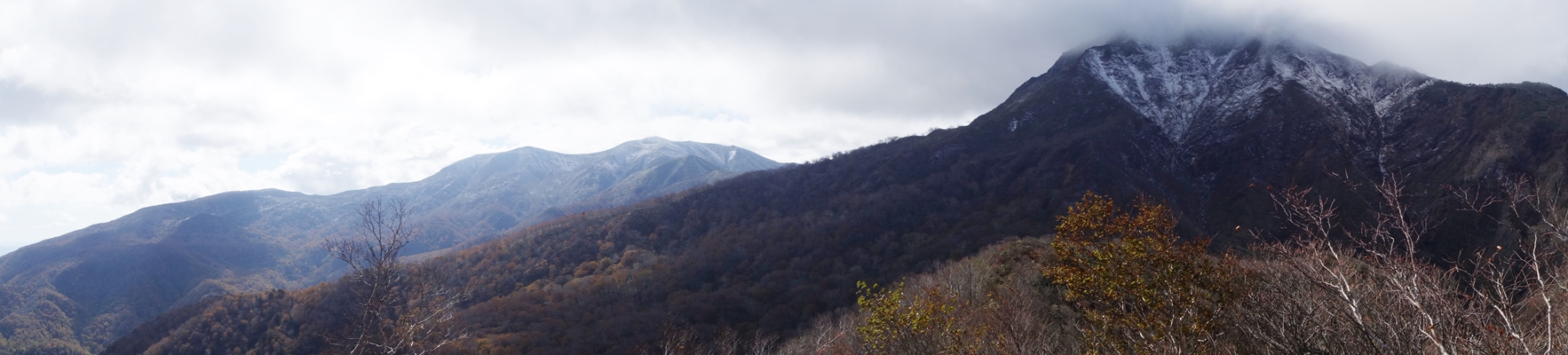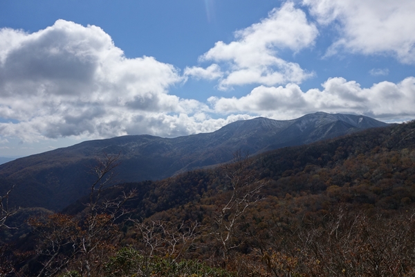 那須連峰側。 旭岳〜三本槍岳あたりは雪化粧。 8月に歩いた赤面山も見えています。 |