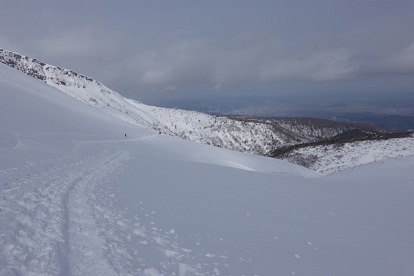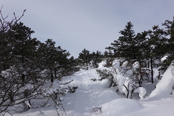 峰の辻から下ってきた道を振り返る。 やわらかめの雪でした。 |