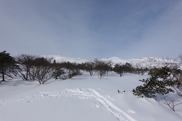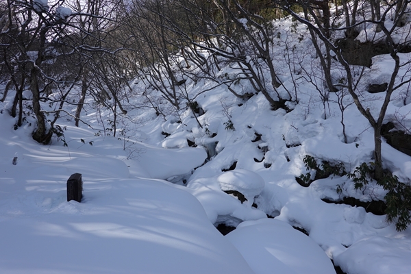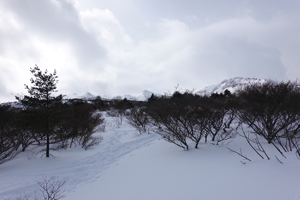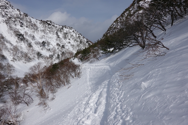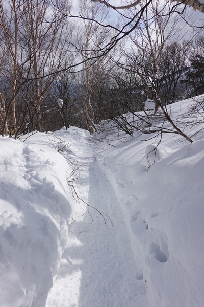 くろがね小屋からの下山道。 平らですが、雪で道幅が狭いトラバース状態のところが長かったです。 |