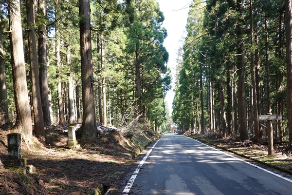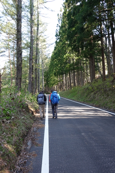 出だしは杉林の中を歩きます。 次男が不調でお腹が痛いとか。 |