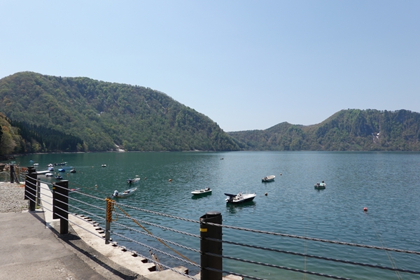 なんとか湖畔に戻ってきました。 左が前山で右手が惣山。 ヒメマス釣りの船も、岸から釣っている方も多数いらっしゃいました。 |