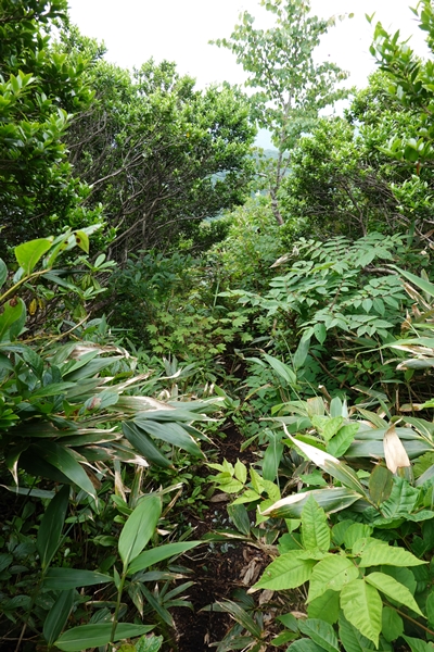 さて、下山します。 出だしは足元が見えにくい笹の道。 |