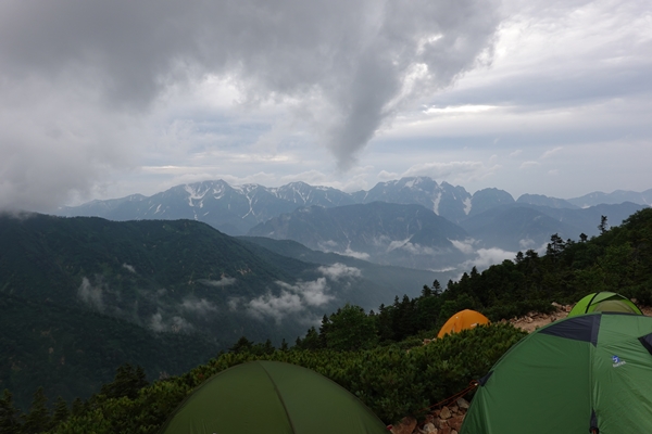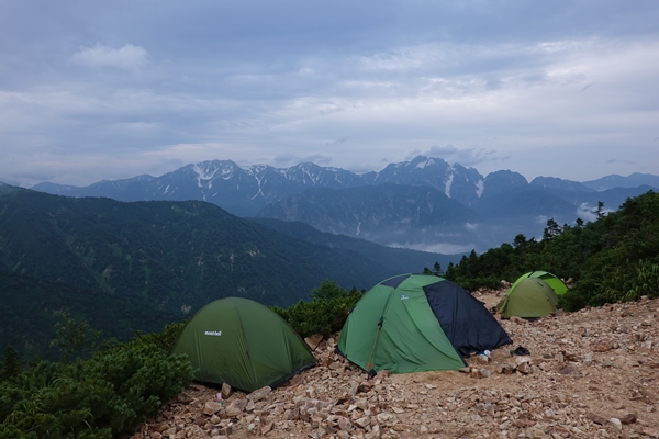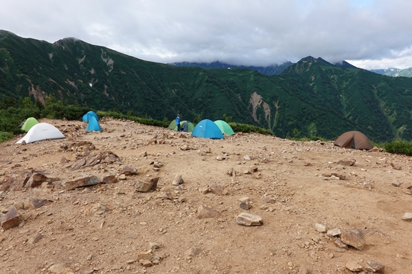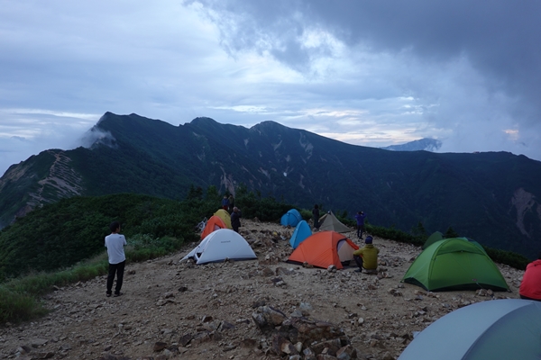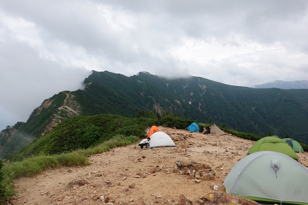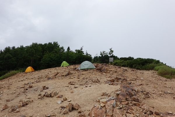 爺ヶ岳もキレイに見えてます。 この日のテント場はまばらな張り具合でした。 |