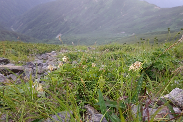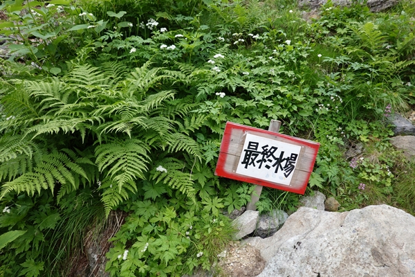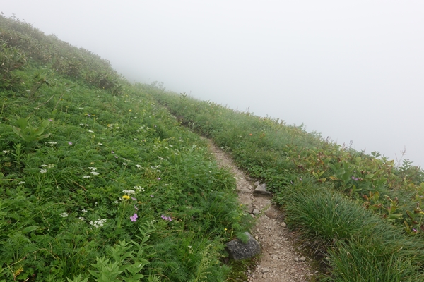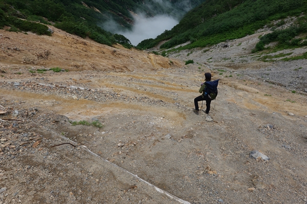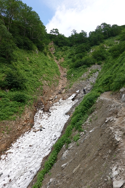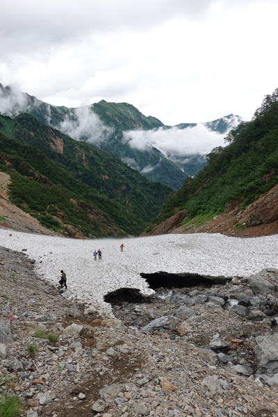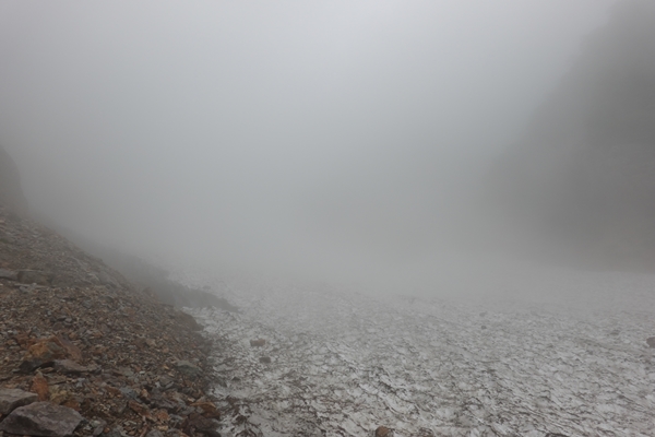 雪渓歩き終了。 ガスで全体像が見えませんが、涼しくて歩きやすかったです。 どこを歩けば良いのかよく分からず、雪渓の真ん中あたりをてくてく。 一緒に歩く方がいたおかげで心強かったです。 |