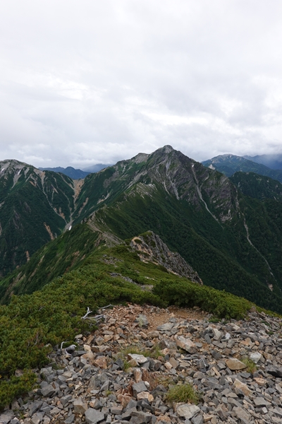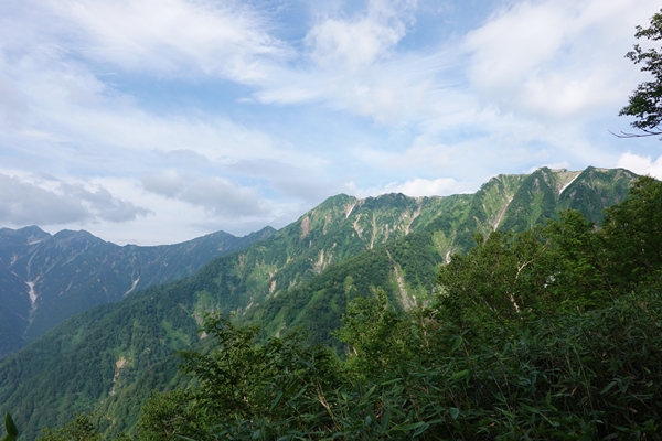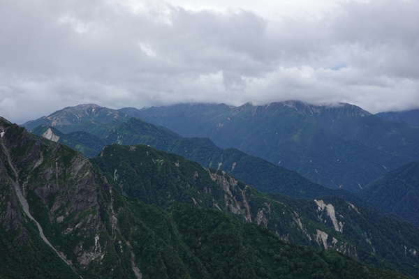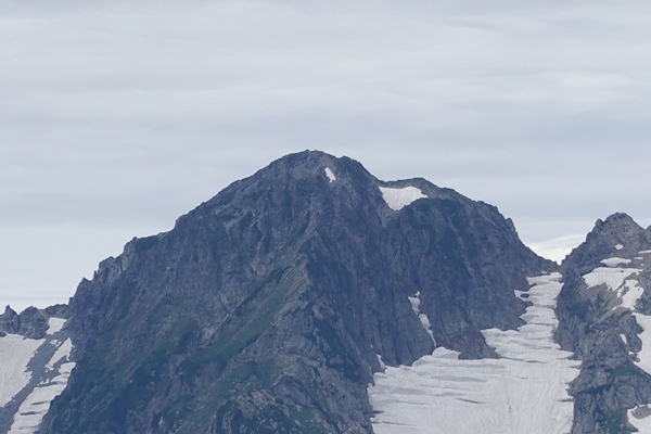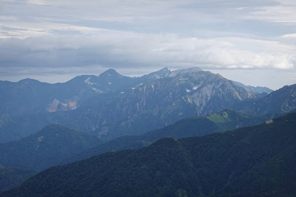 針ノ木岳、そんなに遠く見えないのですが、間に山が3つ。 |