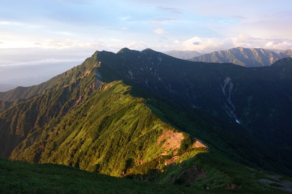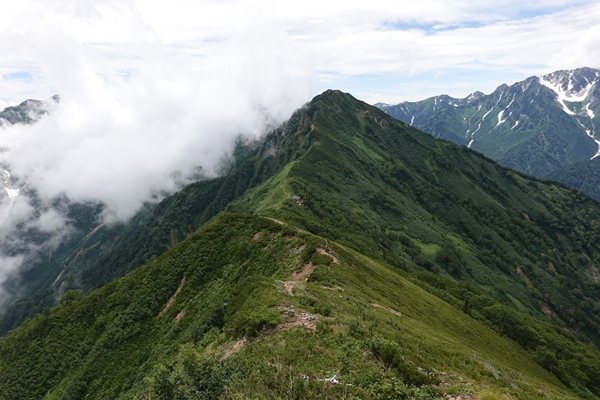 爺ヶ岳〜針ノ木岳・蓮華岳に続く縦走路、右側には立山・剱岳、よかです。 |