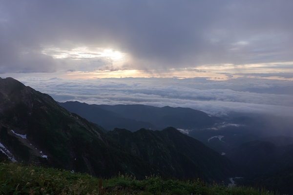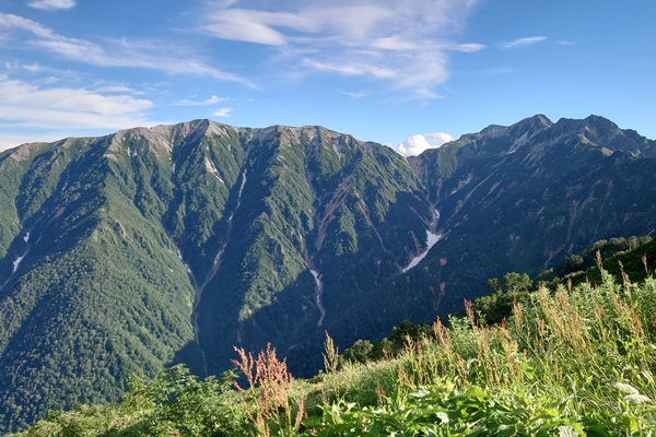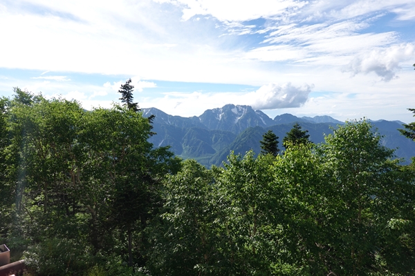 部屋の窓からの景色。 雲が取れて、蓮華岳や針ノ木岳も良く見えます。 |