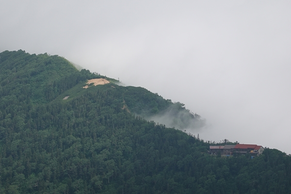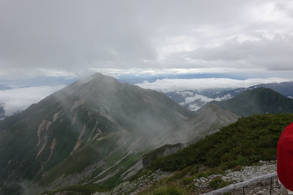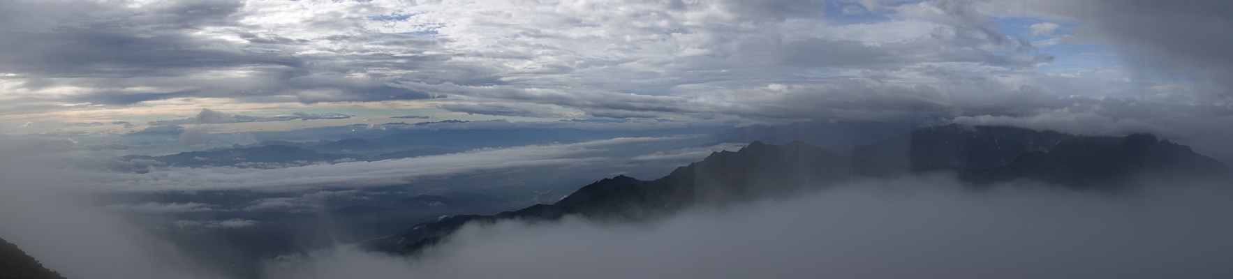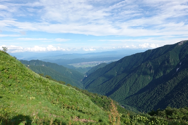 雲が一瞬切れて爺ヶ岳やふもとの町が見えました。 |