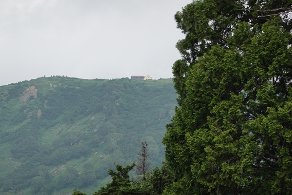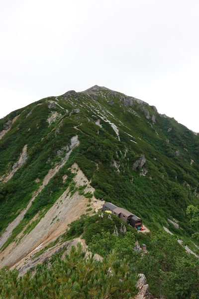 冷池山荘とその上にあるテント場にズームイン。 まだ遠い。 |