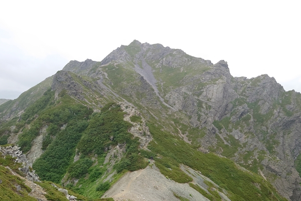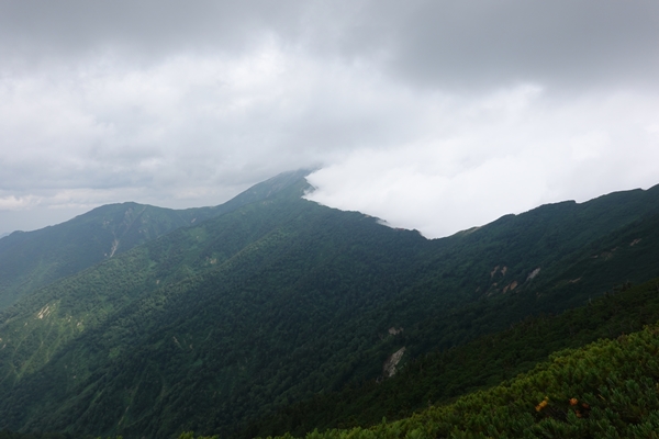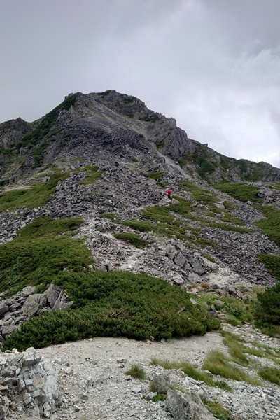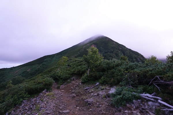 スバリ岳・・かっこいいけど急登を息を切らせて登りました。 途中小雨も降ってきて、雨具やザックカバーを装着。 |