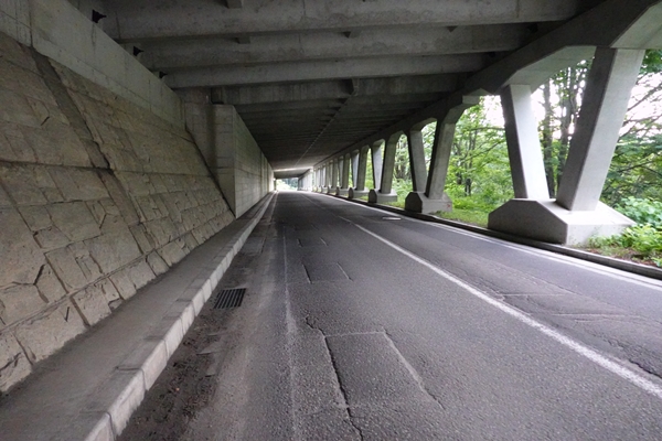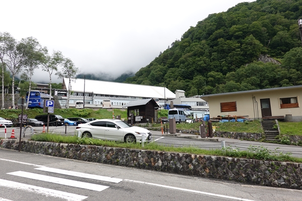 扇沢までの長い下りの始まり。 急な斜面につづら折りの道が作られています。 |