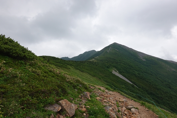 山頂到着。 歩いてきたスバリ岳からの道。 |