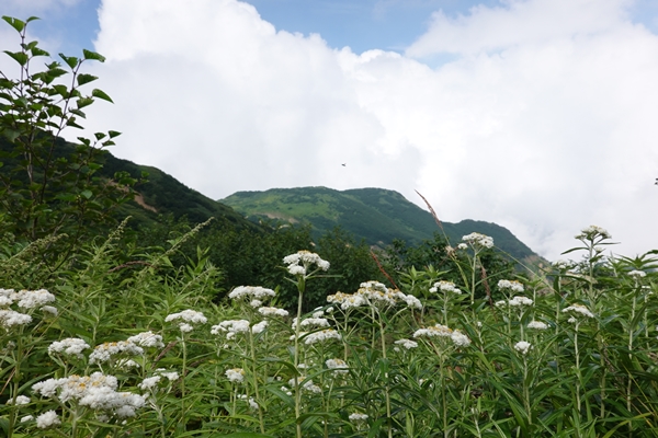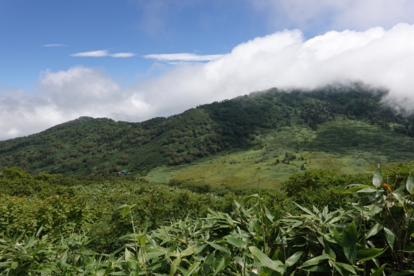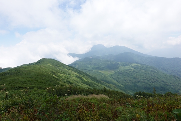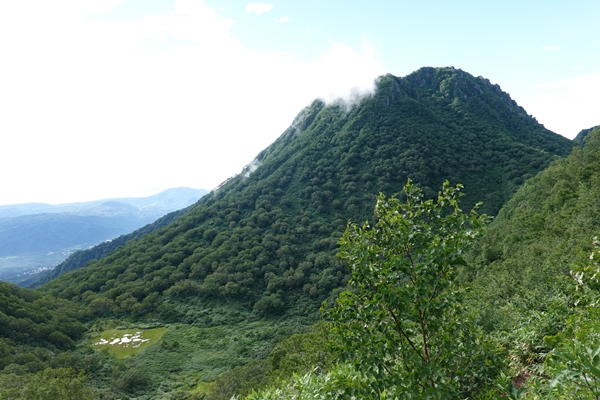 向かいの妙高山も見えてきました。 高谷池ヒュッテも小さく見えてる。 |