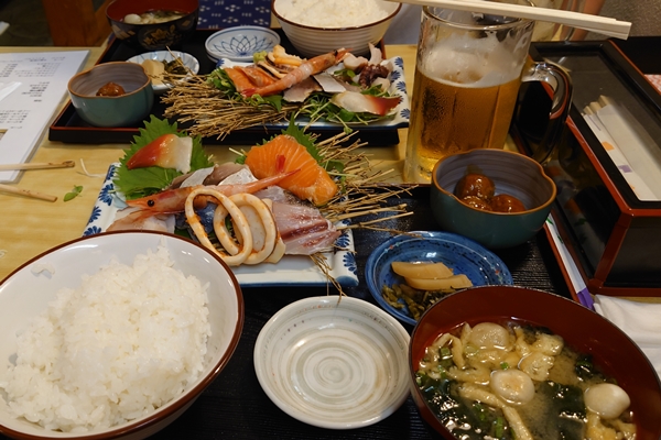直江津のビジネスホテル近くの「樹八」という食事処で夕食。お目当ての大衆居酒屋はお盆休みでしたが、 刺身定食+αでビールがうまかった。 |