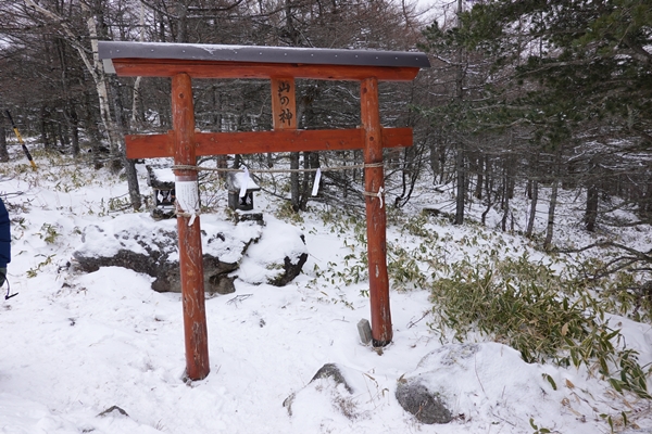 登山口横の鳥居。 ギリギリ雪で覆われているくらいで、積雪はだいぶ少ない状況。 |