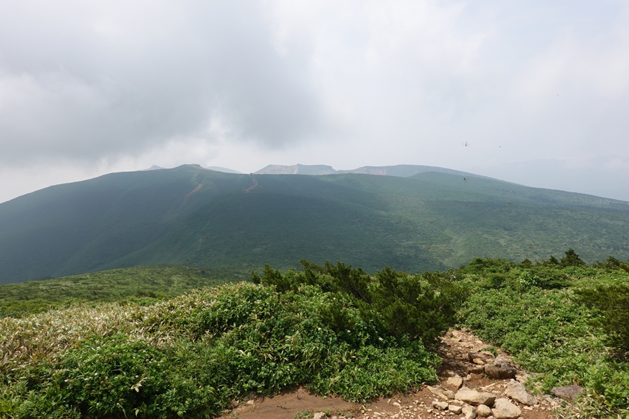 山行記へ 山の写真へ 山ある記Topへ ルート 第1日 沼尻登山口〜胎内コース分岐〜沼尻鉱山跡〜胎内岩〜鉄山避難小屋〜笹平分岐〜箕輪山山頂〜笹平分岐〜 鉄山避難小屋〜鉄山〜馬の背〜安達太良山〜沼尻登山口分岐〜船明神山〜沼尻登山口 備考 累積標高差:約1100m コースタイム:7時間 第1日 三連休ですが、天気が良いのは初日の土曜日だけの予報。トレーニングがてらしっかり歩いておきたいとこ でしたが、遠出するのも厳しいので毎度おなじみの安達太良山を久し振りの沼尻登山口から歩くことにし、 土曜日にしては早起きして出発。登山口の手前がスキー場の中を走るのですが、7年ぶりで全然記憶なかったです。 登山口の駐車場は広く20台くらいは止まっていたと思いますが、まだまだ余裕ありました。準備をして7時半頃出発。 熊出没注意よりも、硫化水素ガス注意の方が目立っているのが沼尻登山口ならでは。幅の広い登山道を少し歩くと 展望台が現れ、白糸の滝が小さく見えます。すぐ上に第2展望もあり、白糸の滝はこちらの方がよく見えるかな。 その後もなだらかな道を歩き、船明神山と沼尻鉱山跡に下る道の分岐まで30分ほどで到着。 分岐から一旦下って沼尻鉱山跡へ。沼尻温泉・中ノ沢温泉の元湯でもあり、ものすごい勢いで温泉が流れてます。 川の色も白っぽくなっていてぬるい感じで温泉感があり、登山道でも硫化水素臭が濃いのですが、登山道を外れると 亡くなられた方もいるのでもっとすごいとこがあるんでしょうね。登山道は小屋裏に回り込む感じなのですが、 看板が小さくて他の道の方が目立っているの迷い込まないように注意も必要ですね。なだらかな登山道を歩いていくと 渡渉ポイントがあるのですが、全く記憶になくてここでも危うく登山道でないとこに迷い込むとこでした。。 ヤマレコアプリとGPSに頼りきりで、山の地図で情報とることが減っているんですが、事前確認も重要だなと 感じた次第。下流側の温泉色した川と違って水がものすごく澄んでいてきれいなところを通過し、斜面を登り始めると 今回のルートでは急な方なので息切れ。。だんだん視界も開けてきますが、雲があるので裏磐梯方面の視界は今一つ でした。ほどなくして胎内岩に到着。胎内くぐり、狭いのでザックを外して這わないとくぐれないのところなんですが、 岩をよじ登るのも頑張ればできるくらいで、前回もくぐらずによじ登ったので今回もと手をかけたんですが、 1回目は登り切れず落下。。。一瞬あきらめてくぐろうかと思ったものの、7年前登れたのにと再度よじ登って 何とか通過。まだ衰えてないと思い込むことにしましょ〜。 胎内岩を超えるとなだらかになり、岩の上を木に咲く花を見ながら歩くと沼ノ平も現れ、コースの見せ場で ございます。よかですねぇ。登山口から2時間ほどで鉄山避難小屋に到着。当初はここから鉄山に向かう予定 だったのですが、トレーニングにはもう少し歩いた方がよいかと思って反対方向の箕輪山に足を延ばすかと 計画変更。安達太良山には何度も来てますが、箕輪山まで歩いたのは最初に来た1998年以来で実に四半世紀振り。 くろがね小屋に泊まったのもその時のみですが、山ガールなんて言葉も聞かなかった頃、学生は珍しかったのか、 野地温泉までの縦走中に会った方々にも声かけてもらったりしてました。あの我々より元気だったおばさま方も 四半世紀経つとさすがに歩いてないんだろうかと思い出に浸ることもなく、笹平までは木に引っ掛かりながら こんな道だったっけなと思いながら下り、笹平からは展望のある道を登り、避難小屋から30分強で箕輪山山頂に到着。 先客の方は1名、安達太良山〜鉄山の主稜線に比べるとぐっと静かですね。岩の上でアンパン食べたりしてしばし 休憩。吾妻連峰〜磐梯山まで見えるはずですが、雲で遠望は聞かず安達太良山方面だけしっかり見えてました。 山頂はトンボが群舞していて、うっとうしい虫はほとんどおらず快適。20分ほど滞在して戻ります。それでも 4〜5人の方はいらしていて、ピストンする方も縦走されてる方も両方いらっしゃいました。 笹平まで一旦下り、見通しのない灌木の中を歩くような感じで鉄山避難小屋まで登り返す。ちゃんとよけずに 木に引っ掛かりながら歩いていたんですが、抜けられてよかったなと思っていたのですが、後で起きる悲劇の素は きっとこののぼりの間に起きていたと思われます。。この時はそんなことには思い至らず、鉄山山頂へ。 鉄山山頂も見晴らしいいとこですが、沼ノ平はちょっと見づらい感じですね。軽く戻って安達太良山に向けて また一旦馬の背まで下ります。沼ノ平の右側に見つつ、何度も歩いた稜線を経て安達太良山に到着。歩き始めてから 4時間を超えだんだん疲れてきたので小休止。乳首の上まで行くつもりなかったのですが、休憩している間に やっぱり登ろうかという気になり梯子を上ったのですが、そのあたりでプシュ・・・!!発射したのは一