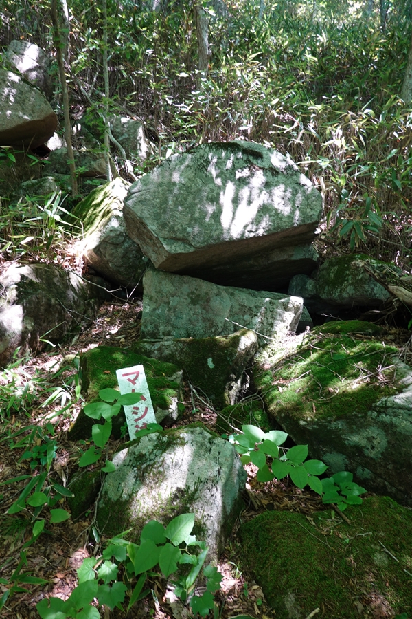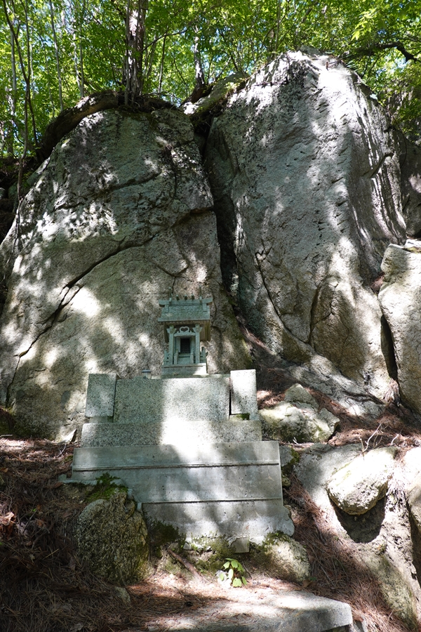 大きな岩の前に祠。 左右どちらにも踏み跡があり、左回りで山頂へ・・岩の上に積もった葉っぱを道と勘違いしてヒヤッとしました。。 |