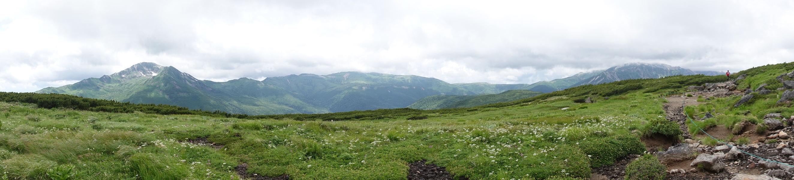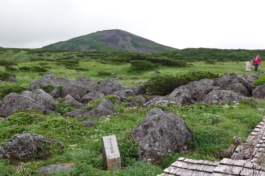 なかなかない風景の中を歩く妻。 尾瀬のような湿原でも、美ケ原のような人の手が入った草原でもない、山の上の草原。 |