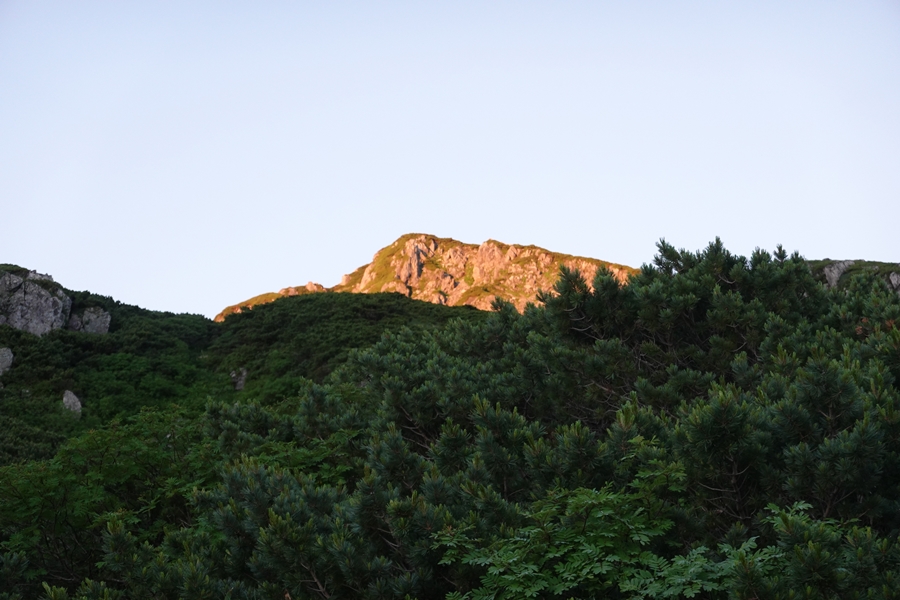 雪渓を超えたところで鷲羽の肩に朝日。 |