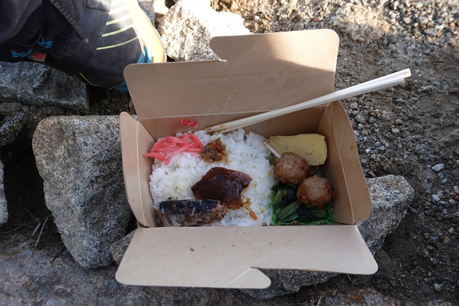 三俣山荘のお弁当で朝ご飯タイム。 酢飯になっていて美味しかったです。 |