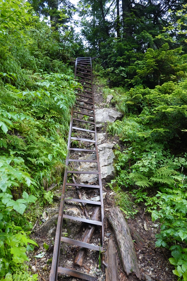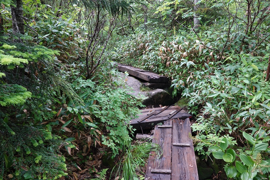 薬師沢小屋名物?の吊橋を渡って2日目スタート。 どうしても下を見ながら歩くし、怖いですね。 |