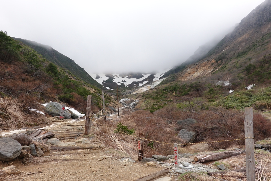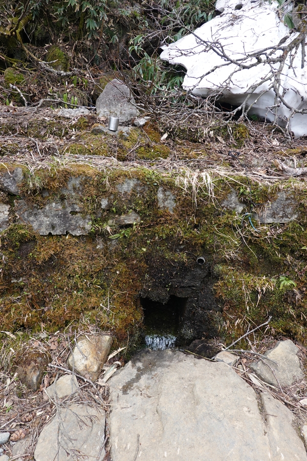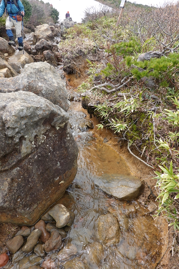腹ごしらえして山頂を目指して歩いていきます。 だいぶ雪も消えて水が流れている感じはなかったですが、残雪が少し。 |