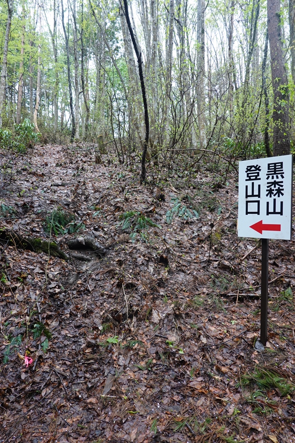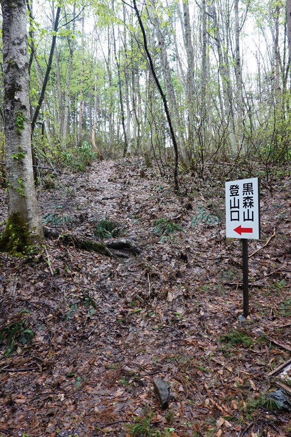 新緑の森の中を歩きます。 木々の奥に黒森山登場。 |