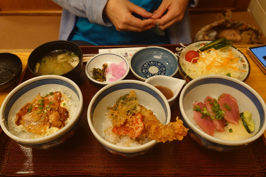 前日の夕食は田島の富じ亭で。 こちらは妻の三味丼セット・・豚丼と天丼と鉄火丼。 |