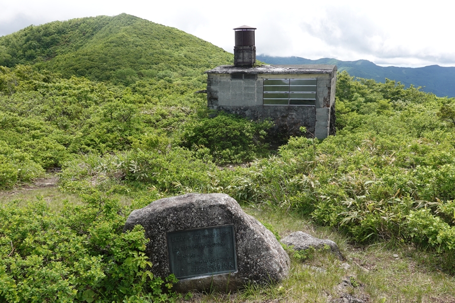 カケスヶ峰到着。 歩いてきた雁戸山からの山並みが見えてくれました。 |